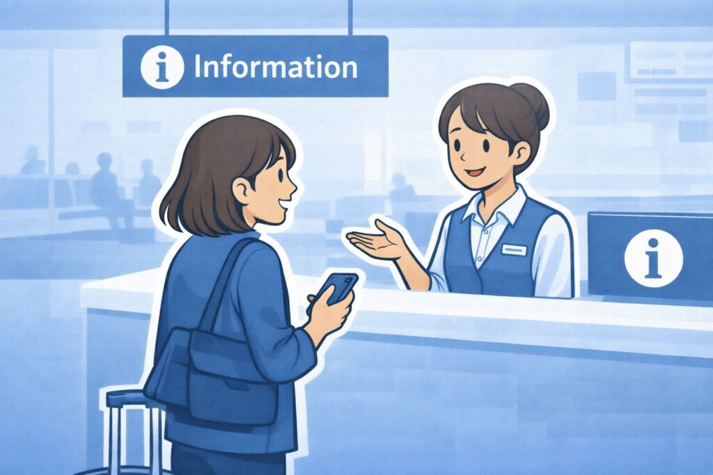 空港内で、「どこへ行けばいいか分からない」「誰に聞けばいいか分からない」ときは、空港インフォメーションを頼りましょう。空港インフォメーションは、今いる空港の事情を一番把握している存在です。