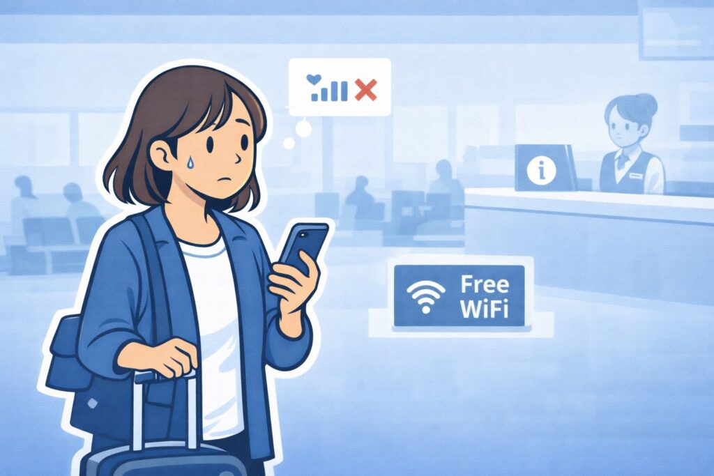 空港のトラブルで意外にも一番困るのが「ネットが使えない」状態です。翻訳やフライト情報の確認、航空会社への連絡、代替便の検索やホテルの手配など、最近の海外旅行ではネット環境が必須になりつつあります。