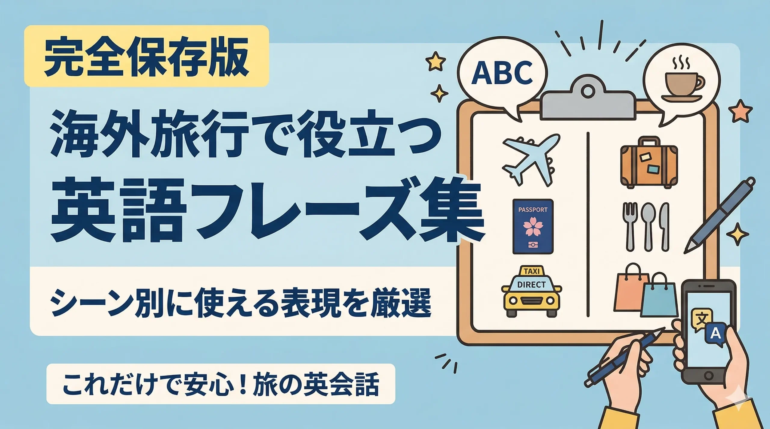 この記事では、空港・ホテル・レストラン・移動・トラブルの5シーン別に、そのまま使える英語フレーズをまとめました。旅行前にサッと確認しておきましょう。